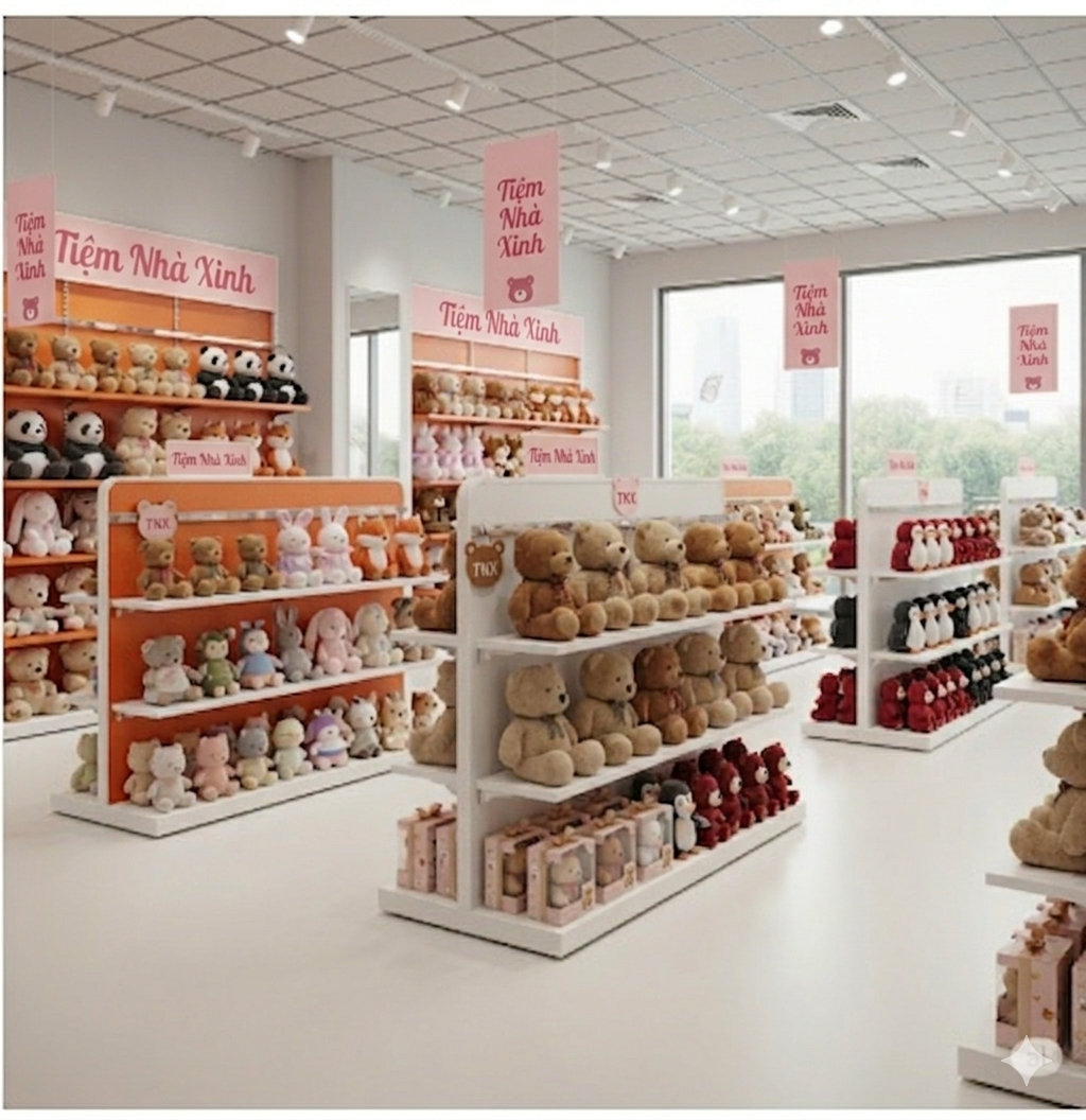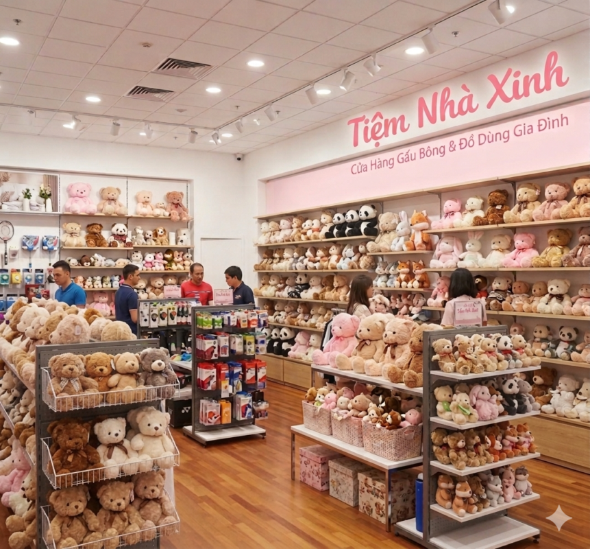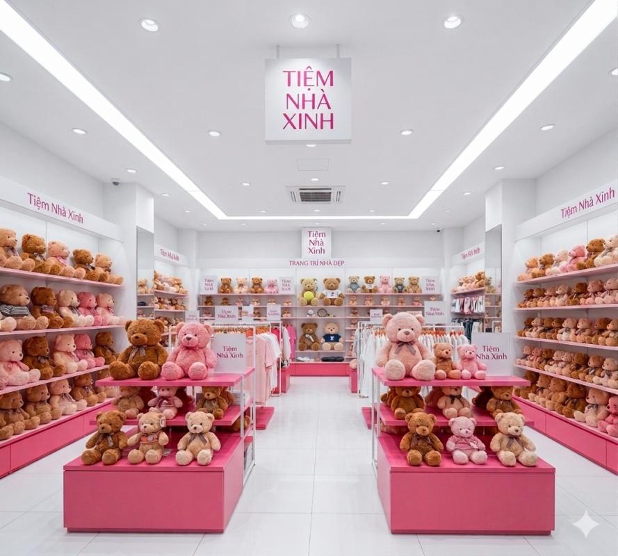 Ngay từ những ngày đầu, Tiệm Nhà Xinh đã tập trung xây dựng danh mục sản phẩm đa dạng, từ những chú gấu Teddy khổng lồ, thú bông nhân vật cho đến các phụ kiện nhỏ nhất như áo gấu, nơ cài và hộp quà thiết kế riêng. Chú trọng vào chất liệu bông gòn trắng tinh khiết và vải nhung cao cấp không gây kích ứng da.